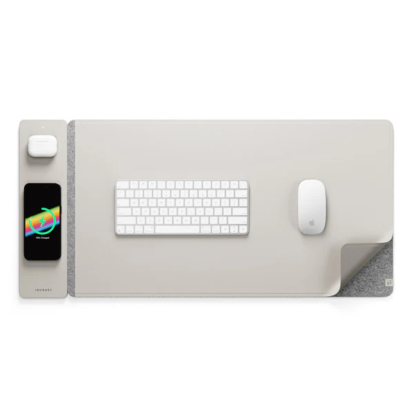 وحدة شحن لاسلكي سريعة ومعيارية للهاتف والسماعات تتصل مغناطيسيا تصميم مزدوج الوجه قابل للعكس مع جلد نباتي فاخر من جهة وشعر من الجانب الآخر. مخبأ لحفظ الملاحظات والأوراق المتناثرة مرونة في استخدام ووضع الشاحن اللاسلكي حسب الحاجة على الجانب الأيسر أو الأيمن ينظم المكاتب مع تقليل الفوضى وزيادة الإنتاجية.